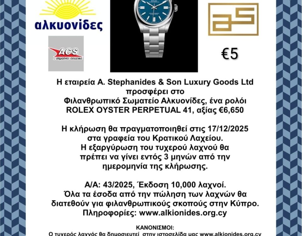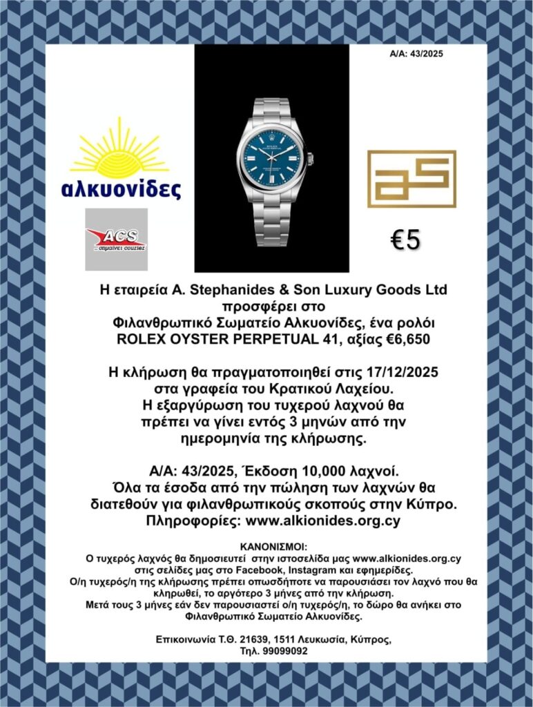 Η κλήρωση θα πραγματοποιηθεί στις 17/12/2024 στα γραφεία του Κρατικού Λαχείου